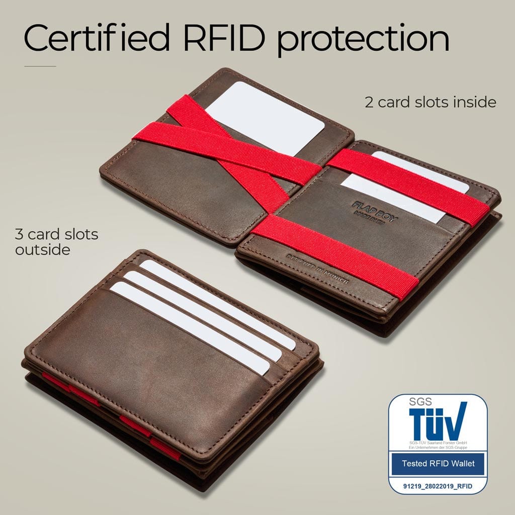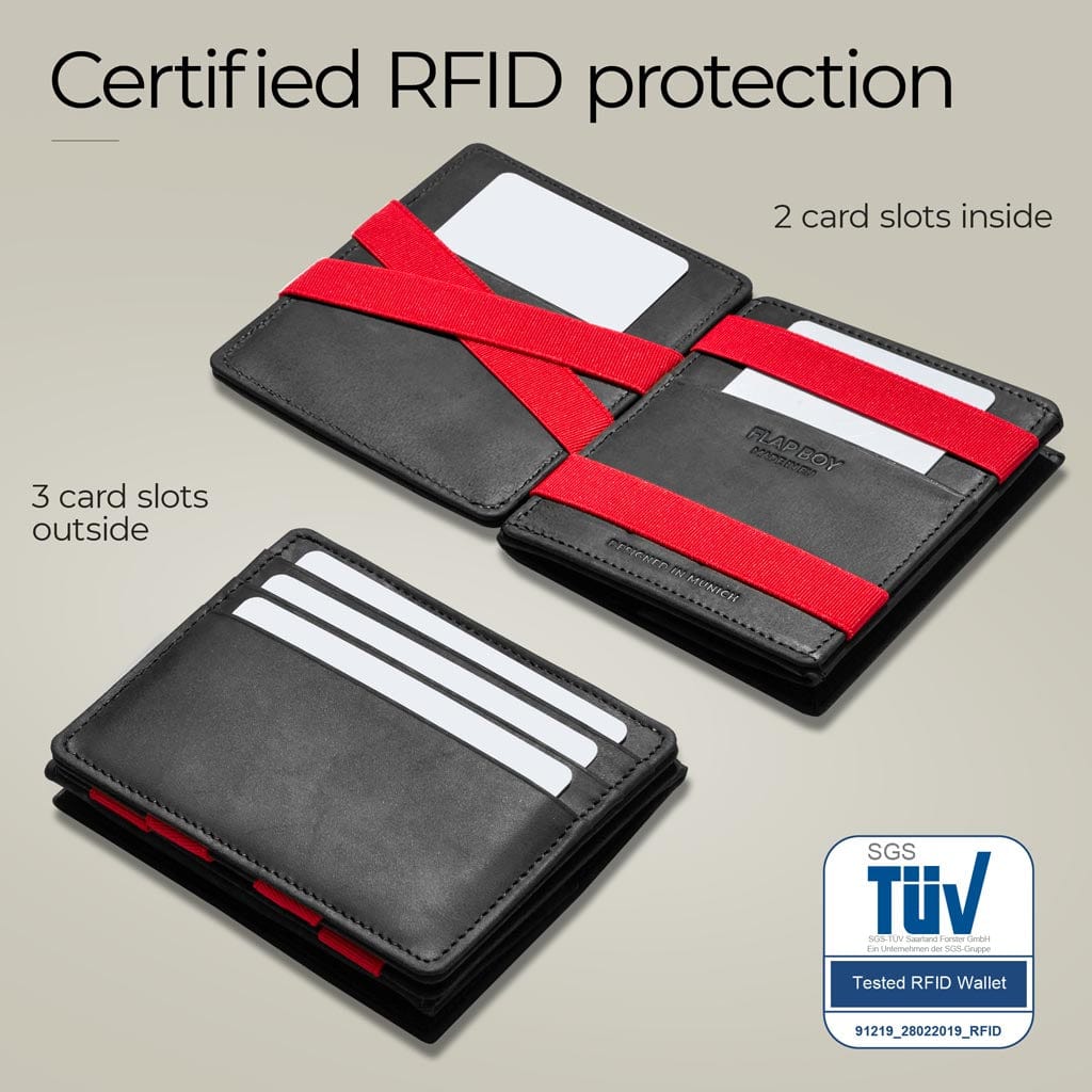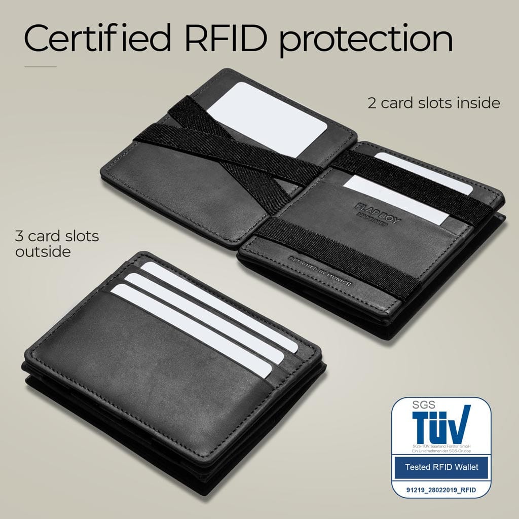 Il Flap Boy ha un ampio scomparto per le monete. Pertanto è più spesso del Flap Boy Slim e ha 3 slot per carte di credito in meno. Il Flap Boy Slim non ha uno scomparto per le monete. Per il resto, i due modelli sono identici. Il Flap Boy XL ha lo stesso ampio scomparto per le monete del Flap Boy, ma offre un ulteriore scomparto per le carte con una linguetta a strappo per 6 carte. Inoltre, le fessure per le carte del Flap Boy XL sono tutte all'interno del portafoglio e non sono visibili dall'esterno.