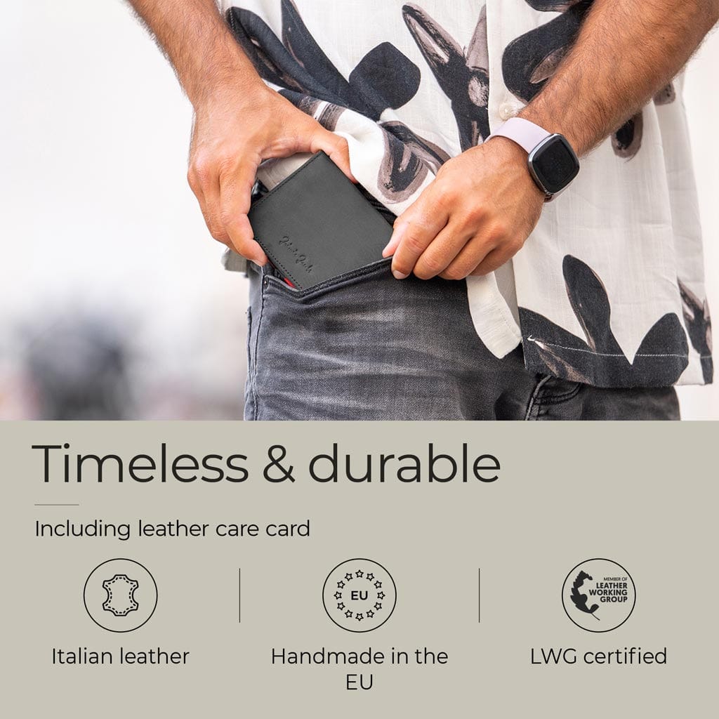Abbiamo deciso di produrre i nostri portafogli solo con alcune manifatture di pelle europee di piccole e medie dimensioni, rapidamente raggiungibili in auto da Monaco. Solo in questo modo possiamo garantire condizioni di lavoro eque e la migliore qualità del prodotto. Inoltre, i nostri prodotti non devono essere spediti in tutto il mondo.