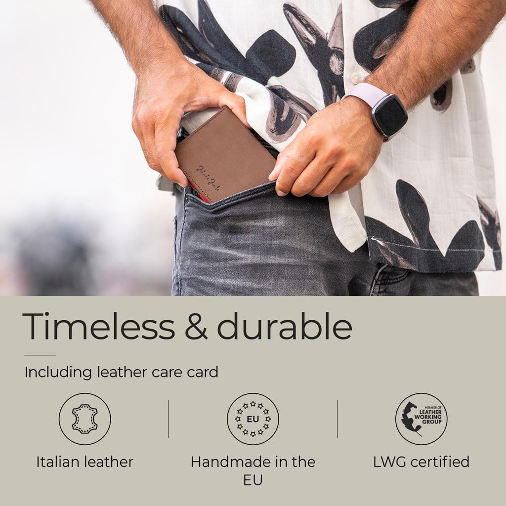 Tutti i nostri portafogli sono realizzati a mano con le migliori pelli bovine italiane e materiali selezionati. Offriamo alcuni dei nostri modelli di portafogli anche in pelle vegana. Questi portafogli sono 100% vegani, realizzati con una replica in pelle vegana. Non vengono utilizzate sostanze animali.