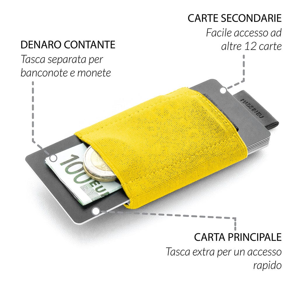 Il Serie Nano Boy Pocket può contenere fino a 13 carte. Dispone di uno scomparto principale con un innovativo meccanismo a strappo per un massimo di 12 carte e di uno scomparto per l'accesso diretto alle carte più utilizzate o alle due carte più utilizzate.