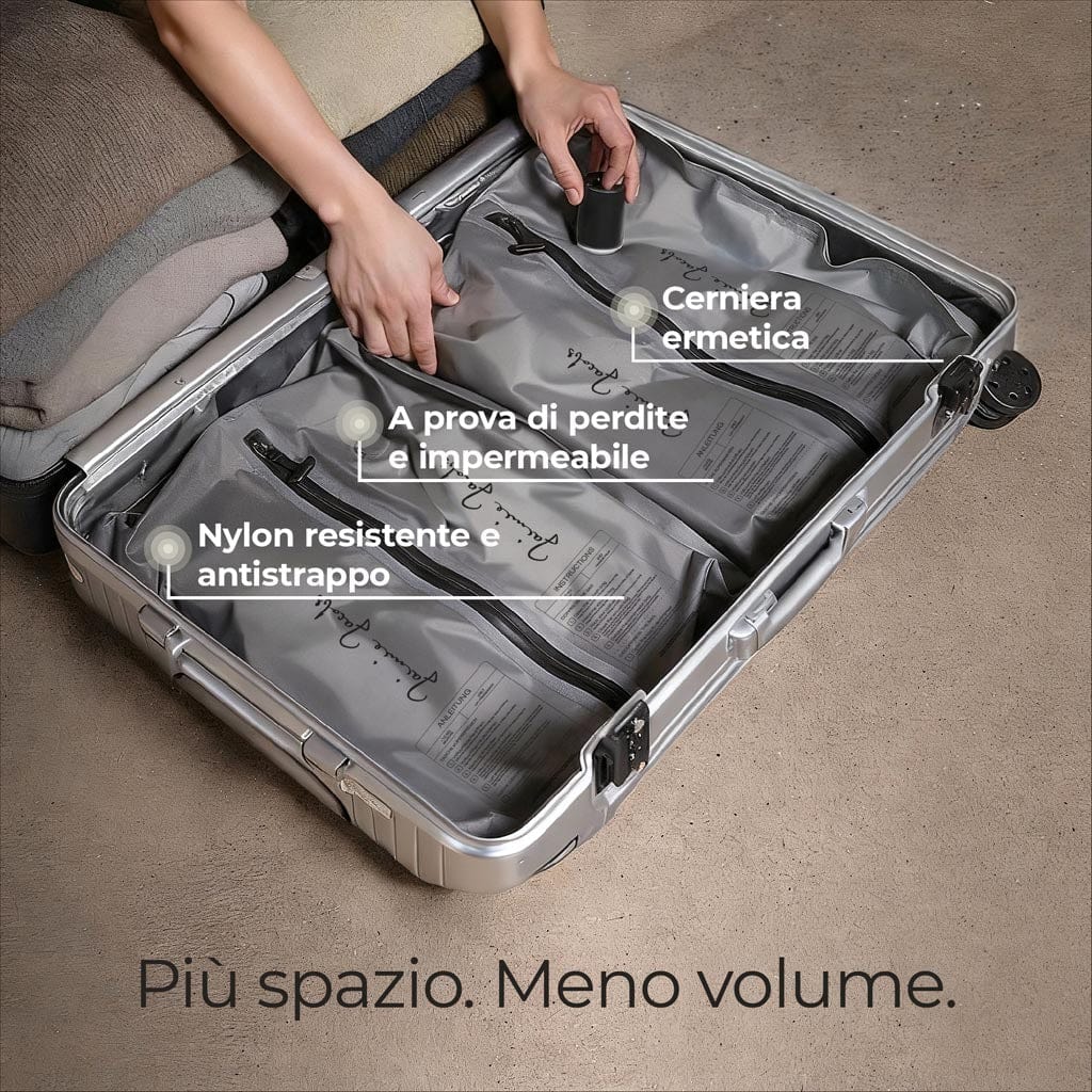 • Comprimi i tuoi vestiti e crea 3 volte più spazio in qualsiasi borsa o valigia